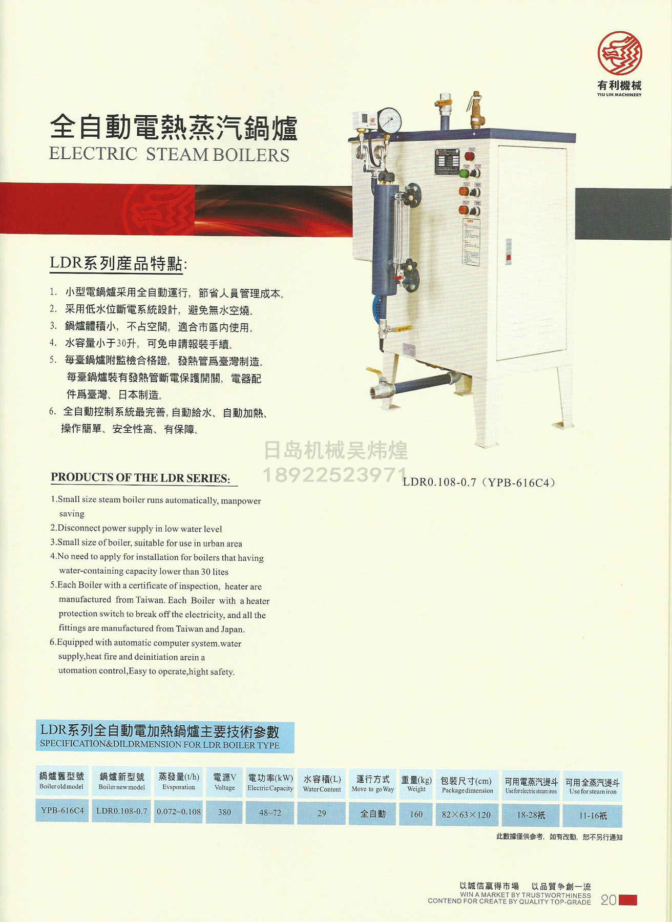 • 有利牌YPB-616C4全自動(dòng)電熱蒸汽鍋爐48-72KW